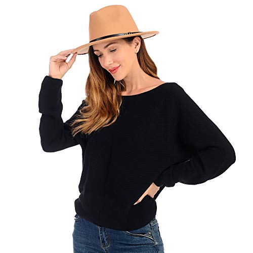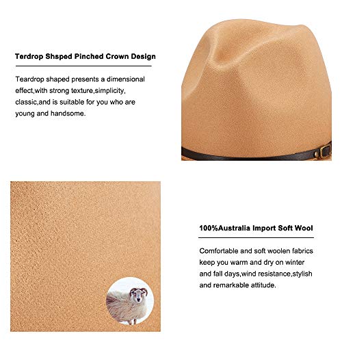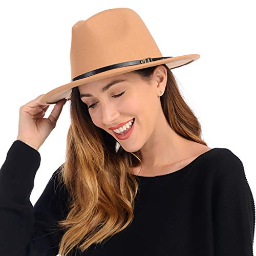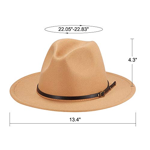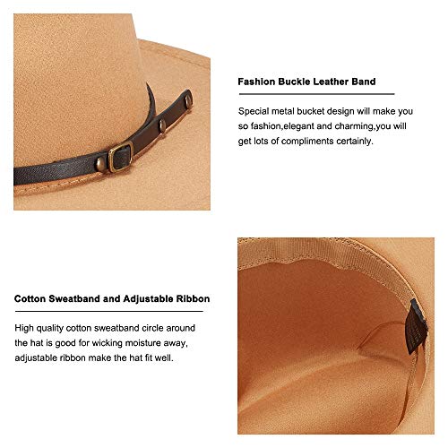 AQ Womens Felt Fedora Hat, Wide Brim Panama Hat Floppy Wool Winter Hat with Belt Buckle Camel
