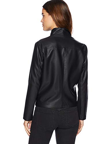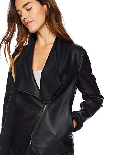100% Polyurethane Imported Zipper closure Hand Wash Faux-Leather Jacket Drape Front Asymmetrical Zipper Rib Knit Sleeves Two Slit Pockets