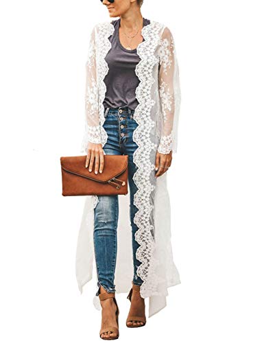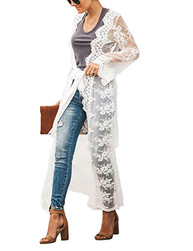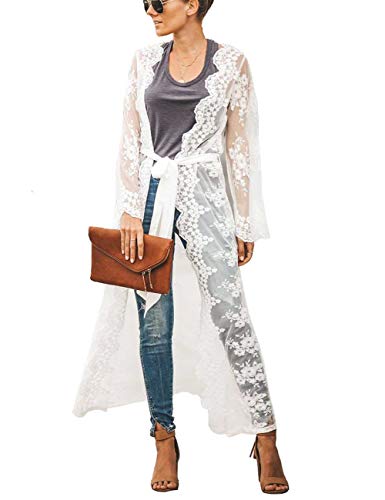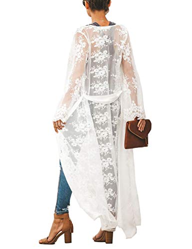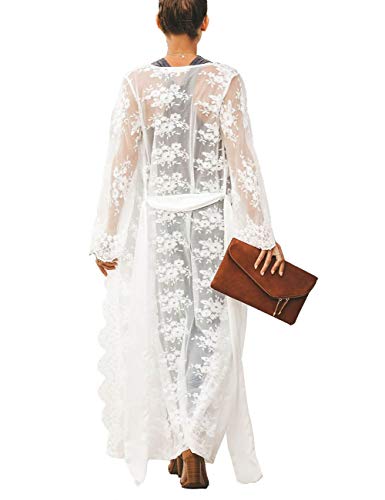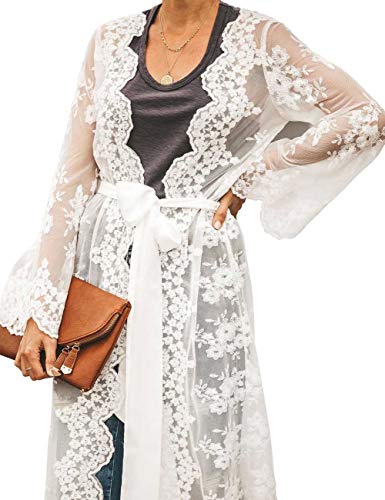 Newest Fashion White Gauze Embroidried with White Flowers,Wide Cut Long Sleeve, Open Front with Belt, Maxi Ankle Length Cardigan