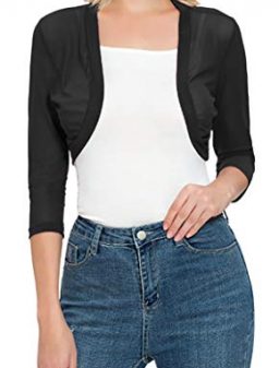 The high stretchy shrug cardigan features 3/4 sleeve, crew neck, hook-and-eye closure at neckline and cropped design.
